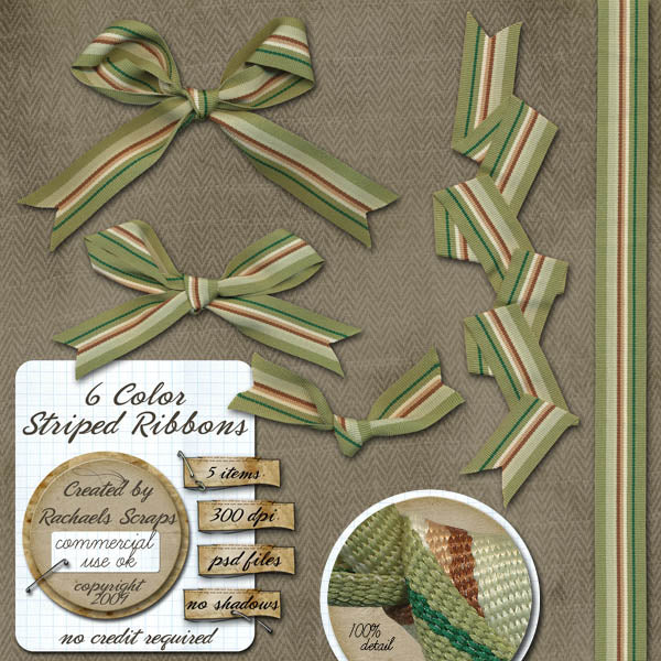 This set contains 5 digital images of real ribbons. Each comes in a separate layered psd file that has the 6 stripes separated out in each layer, so you can recolor the stripes individually, quickly and easily!