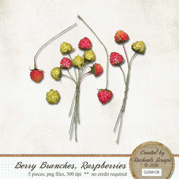 This set contains 5 digital berry branch images. These pieces are vintage style raspberries.