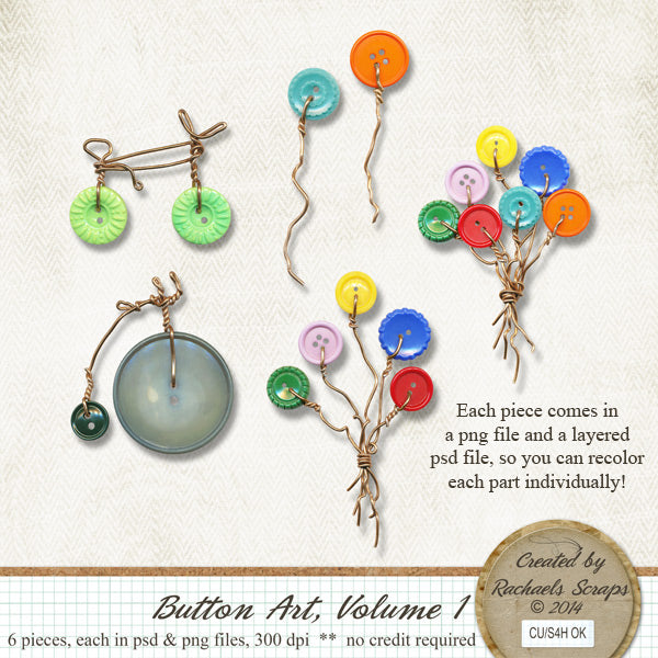 This set contains 6 fun button pieces. Each one comes in a png file and a layered psd file. I created the psd files (each button comes on a separate layer) so you can recolor all of the buttons individually to match your project.