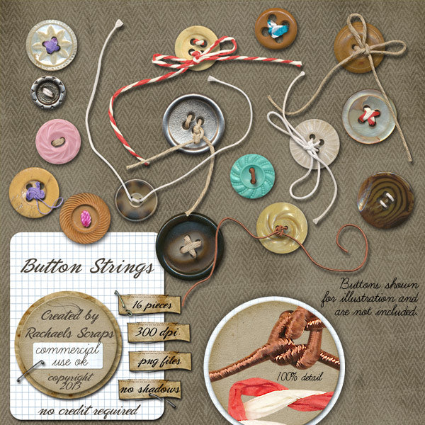 This set contains 16 digital images of various strings to use as button toppers. (Buttons are not included).