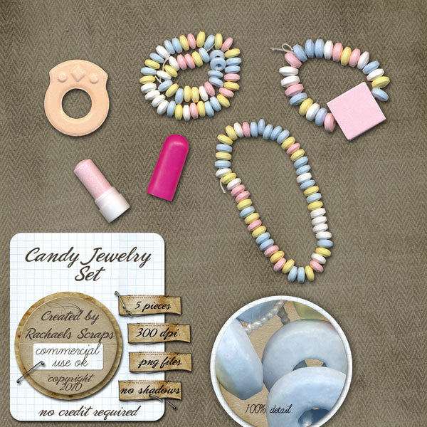 This set contains 5 digital images of candy jewelry (candy necklaces, ring, bracelets, and a candy lipstick with cap).