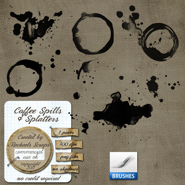 This set contains 7 digital images of spilled coffee drips and coffee rings. They come in separate png files, and all together in a Photoshop brush set.