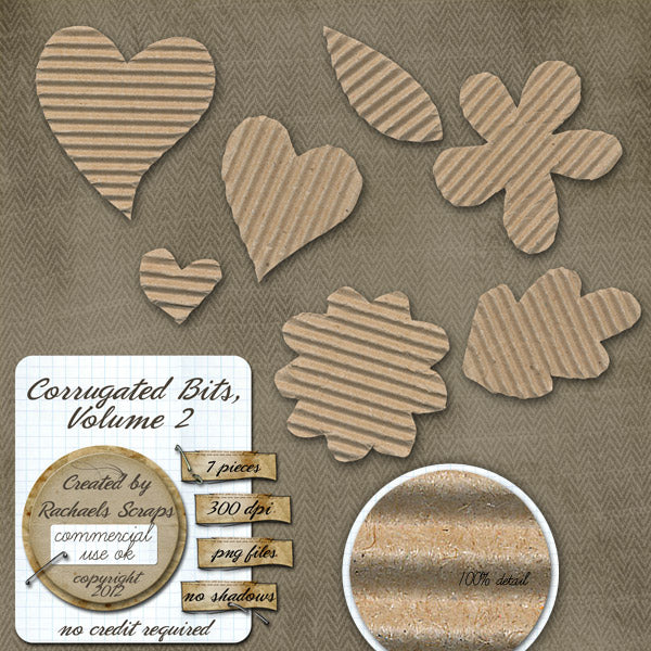 This set contains 6 digital images of corrugated cardboard bits. There are hearts, flowers, and leaf shapes in this set.