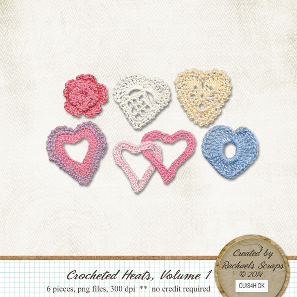 This set contains 6 digital images of crocheted hearts.