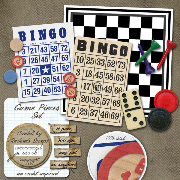 This set contains 14 digital images of various game pieces (13 png elements and a layered psd checkerboard template),