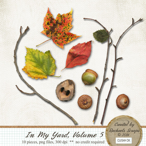 This set contains 10 digital images of a sticks, leaves, and acorns from my yard and garden.
