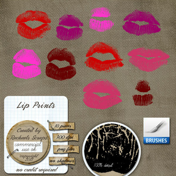 This set contains 10 digital images of real lip prints / kiss prints. They come in separate png files, and all together in a Photoshop brush set.