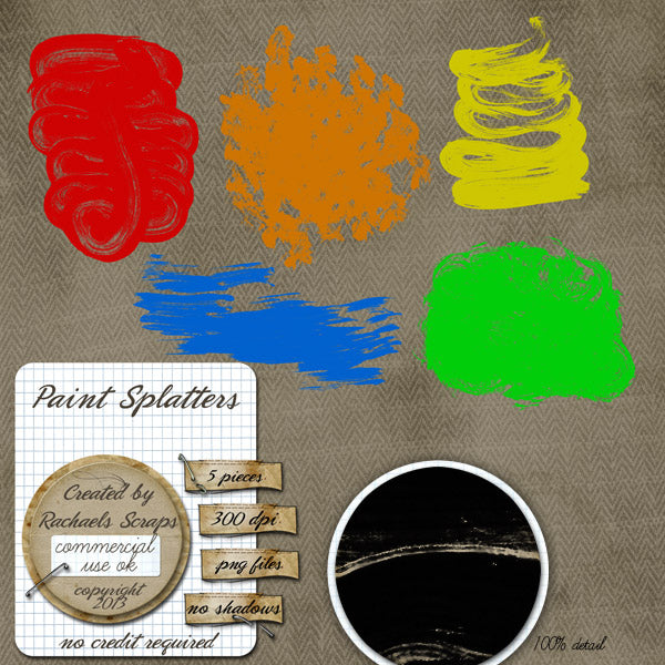 This set contains 5 digital images of paint splatters. They come in separate png files, and in a Photoshop brush set.