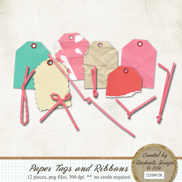 This set contains 12 digital images of paper tags and ribbon strings (6 of each).
