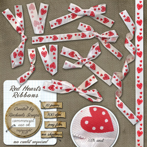 This set contains 10 digital images of white ribbons with a red heart pattern.