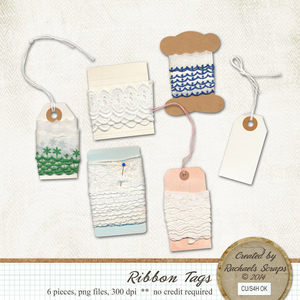 This set contains 6 digital images of vintage paper tags that have been wrapped in lace.