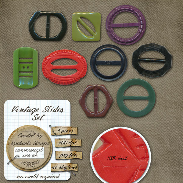 This set contains 9 digital images of vintage slides. These buckles can be added to straight ribbons for some added detail. The center bar can also be removed so that they can be used as frames.