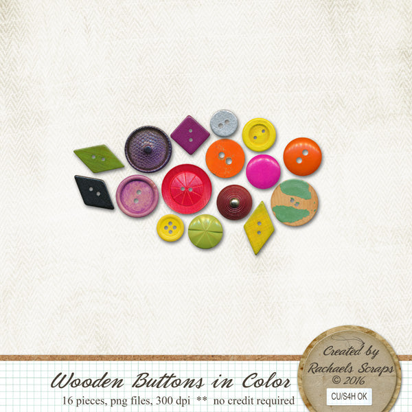 This set contains 16 digital images of colorful wooden buttons. There are round buttons and other fun shapes in this set.